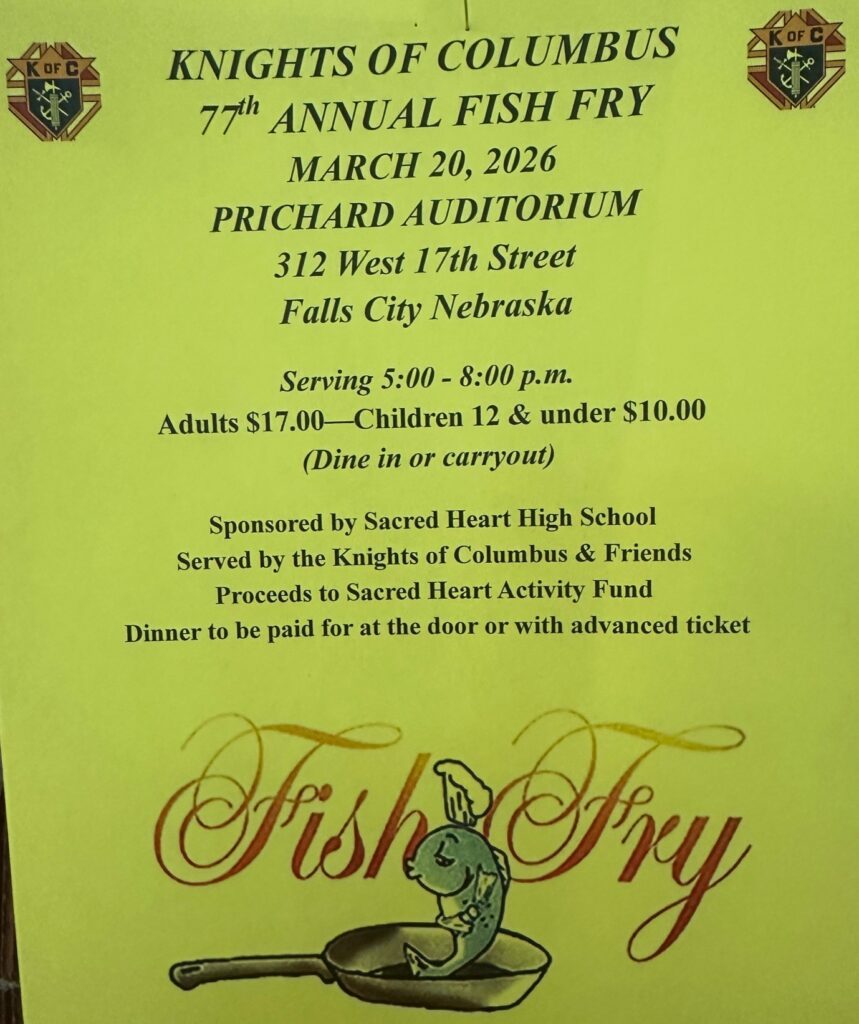 Join us for the Knights of Columbus 77th Annual Fish Fry on March 20, 2026. Enjoy an evening at Prichard Auditorium with both dine-in and carry-out options available. We will be serving from 5:00 to 8:00 p.m. Tickets are just $17 for adults and $10 for children aged 12 and under. This event is sponsored by Sacred Heart High School and served by the Knights of Columbus along with their friends. All proceeds will benefit the Sacred Heart Activity Fund. You can pay for your dinner at the door or purchase tickets in advance.